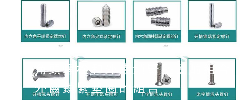 名稱: 1.機螺釘 2.自攻螺釘 3.鉆尾螺釘 4.墻板釘 5.纖維板釘 6.木螺釘7.六角木螺釘 8.不脫出螺釘 9.組合螺釘 10.微型螺釘 11.家具螺釘 12.電子螺釘 頭型: 1.六角頭(hexagon head) 2.六角頭法蘭面(hexagon head with fla
