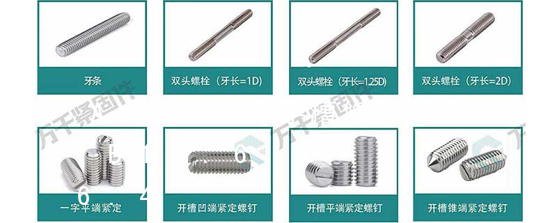 1.機螺釘 2.自攻螺釘 3.鉆尾螺釘 4.墻板釘 5.纖維板釘 6.木螺釘7.六角木螺釘 8.不脫出螺釘 9.組合螺釘 10.微型螺釘 11.家具螺釘 12.電子螺釘 13.鏈帶螺釘頭型 :1.六角頭(hexagon head)2.六角頭法蘭面(hexagon head with flange)3.方頭(square head)4.T形頭T head (hammer head5. B.S.W. 標準惠氏粗牙系列,一般用途圓柱螺紋(英制牙)B.S.F. 標準惠氏細牙系列,一般用途圓柱螺紋 (英制牙)fine pitch thread 細牙full thread 全螺紋 IHH=ind hex head 鋸 六角頭PH=phillips 十字槽Pan 圓頭(盤頭)Oval 半沉頭H.W.H.. 六角小法蘭H.W.F. 六角大法蘭CSK 沙拉頭(沉頭)Large wafer 大