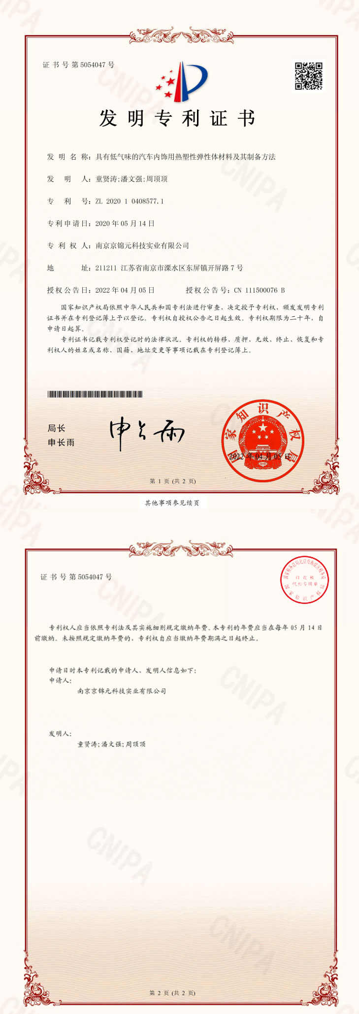ZL 2020 1 0408577.1 具有低氣味的汽車內飾用熱塑性彈性體材料及其制備方法